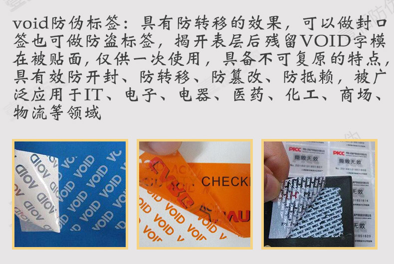 2.用於製做防揭標簽。廣泛適用於IT、電子、電器、醫藥、化工、商場等領域,將防揭標簽貼在產品上,防止標貼、標簽被揭起後再用,用於識別未被授權或非法打開被封產品的現象。